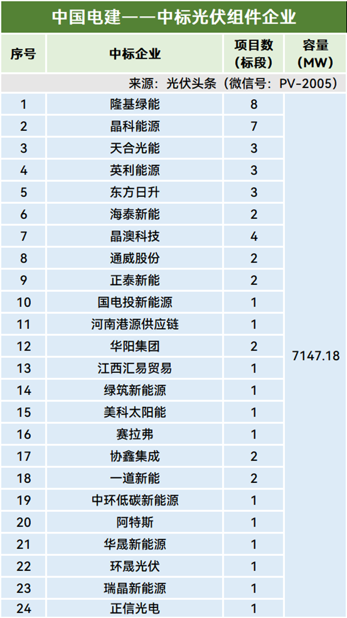 中国电建在本统计周期共有56个项目(标段)定标,规模共计7.15GW,隆基绿能、晶科能源、天合光能、英利能源、东方日升、海泰新能、晶澳科技、通威股份、正泰新能、国电投新能源、河南港源供应链、华阳集团、江西汇易贸易、绿筑新能源、美科太阳能、赛拉弗、协鑫集成、一道新能、中环低碳新能源、阿特斯、华晟新能源、环晟光伏等24个企业中标。