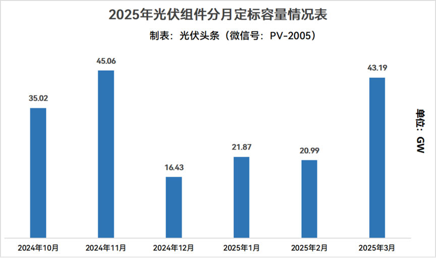 光伏头条根据公开信息统计,3月光伏组件定标容量为43.19GW。与2025年2月相比,光伏组件定标容量有所上升。