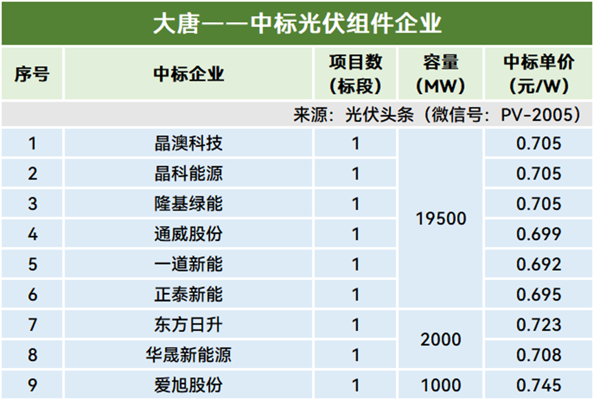6、中标企业方面,晋能科技、隆基绿能、协鑫集成、晶科能源、环晟光伏、东方日升、高景太阳能、国晟科技、美科太阳能、英利能源等94家企业中标。