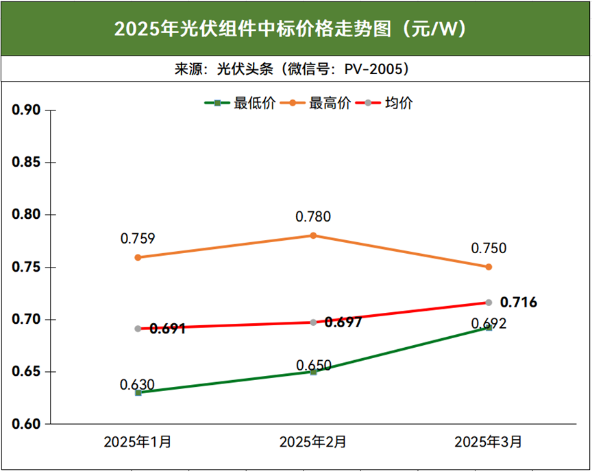 其中3月均价0.716元/W,最低中标价格0.692元/W,最高中标价格0.750元/W;2月均价0.697元/W,最低中标价格0.650元W,最高中标价格0.780元/W;1月均价0.691元/W,最低中标价格0.630元W,最高中标价格0.759元/W。